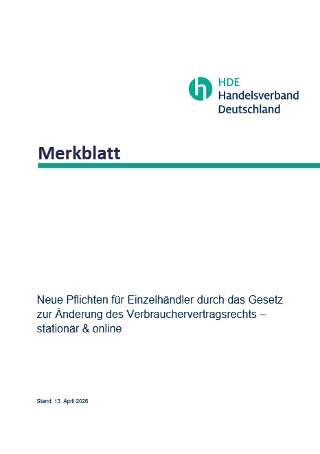 | | | |  | | Verbrauchervertragsrecht: Neue Pflichten für Händler |  | Das neue Gesetz zur Änderung des Verbrauchervertrags- und des Versicherungsvertragsrechts setzt verschiedene EU-Richtlinien in deutsches Recht um. Damit verbunden sind neue Vorgaben, die Einzelhändlerinnen und Einzelhändler unbedingt beachten sollten. So enthält etwa die Richtlinie über den Fernabsatz von Finanzdienstleistungen, die auch für den Onlinehandel bedeutenden Regelungen zur verpflichtenden Einführung der Online-Widerrufsfunktion. Die Regelungen zur Umsetzung dieser Richtlinie treten am 19. Juni in Kraft. Die Richtlinie zur Stärkung des Verbrauchers für den ökologischen Wandel enthält neue Informationspflichten für Händler sowohl im stationären als auch im Online-Handel, die ab dem 27. September gelten. Ein aktuelles Merkblatt des HDE beleuchtet die für den Einzelhandel besonders relevanten Themen der neuen Informationspflichten nach der EmpCo-Richtlinie und der elektronischen Widerrufsfunktion. Zudem beinhaltet die kompakte Übersicht praktische Checklisten und ein aktualisiertes Muster für die Widerrufsbelehrung.
